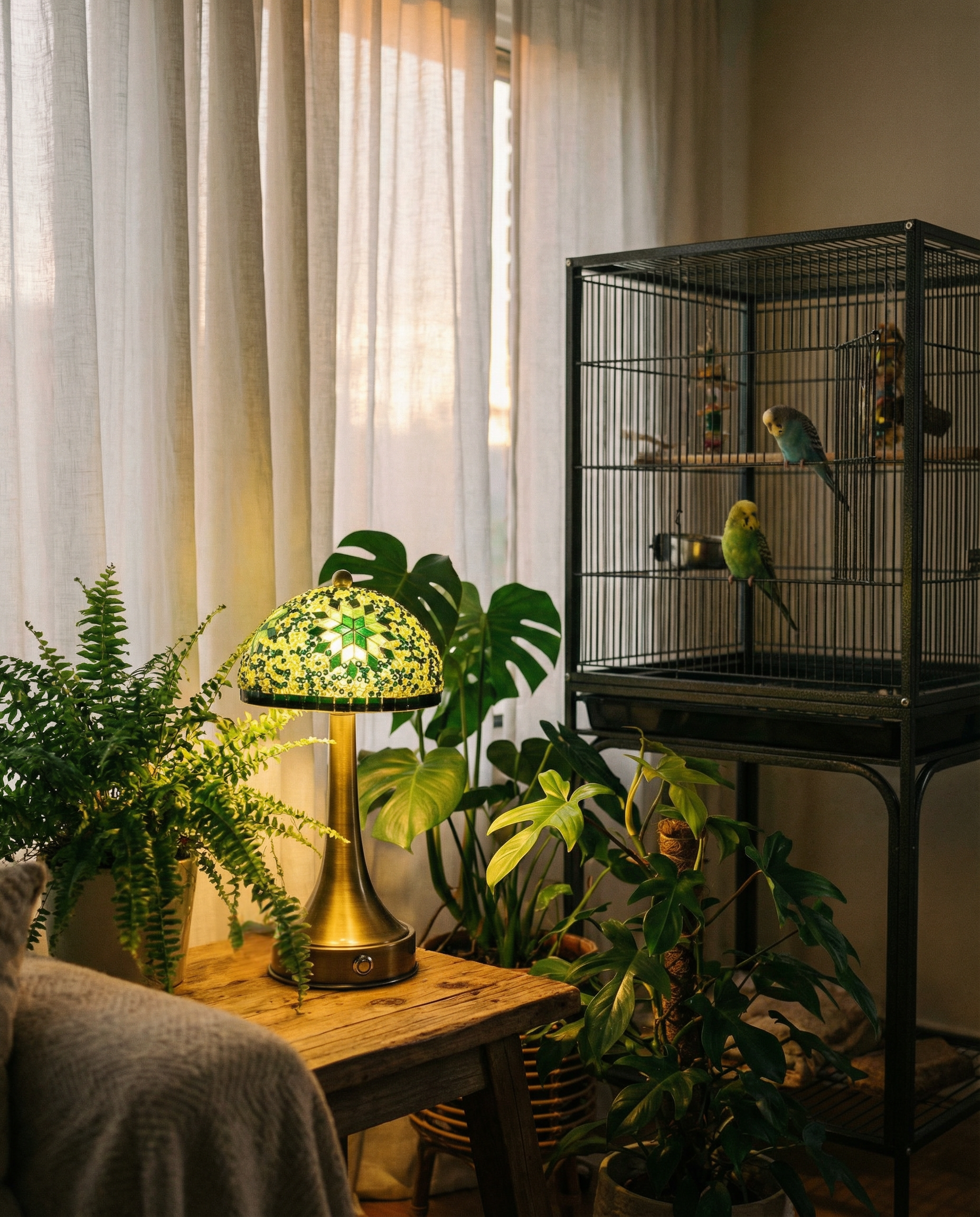 De Parasol LED mozaieklamp in groen geeft een rustige warme en natuurlijke sfeer aan elke ruimte. Zodra je de lamp inschakelt ontstaat er een subtiel wauw moment. De groene mozaiekpatronen werpen zachte reflecties die muren meubels en decor direct een kalme diepe uitstraling geven. Bezoekers merken het vaak meteen. Niet de lamp zelf maar de sfeer die hij neerzet. Ontworpen om de kamer niet alleen te verlichten maar te veranderen.